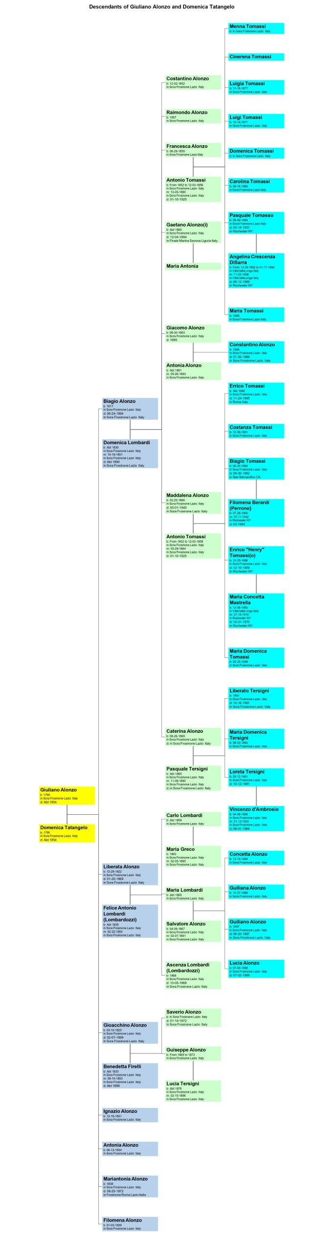 This extensive tree shows the earliest Alonzo ancestor found so far…Guiliano Alonzo (born @1790) who married Domenica Tatangelo (born @1790).